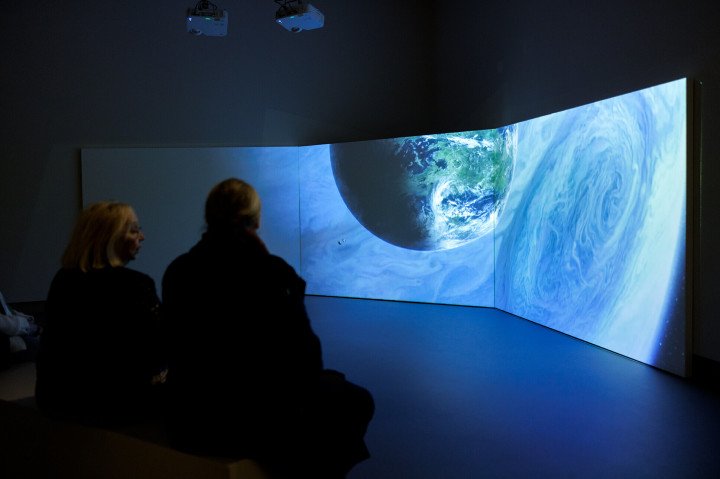 Inside the cabinet is a glass sphere, with the flat earth still shrouded in mist. On the other side, the landscape is built from the purest digital forms, projected onto paper backdrops. The work is an ode to the untouched natural landscape, without humans, a recurring theme for Brand.