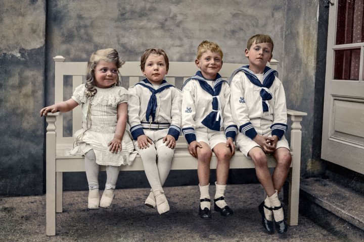 The Klep brothers here pose side by side on a garden bench. From left to right you see successively Ab (born 1907-1983), the youngest and dressed in a dress. Next to him in colorful sailor suits: Han (1906-?), Ton (1904-1983) and Jaap (1903-1976). The boys are part of the highly successful family business, De Etna NV, and they grow up in opulence. The family albums are full of pictures of trips, excursions and children in beautiful clothes.