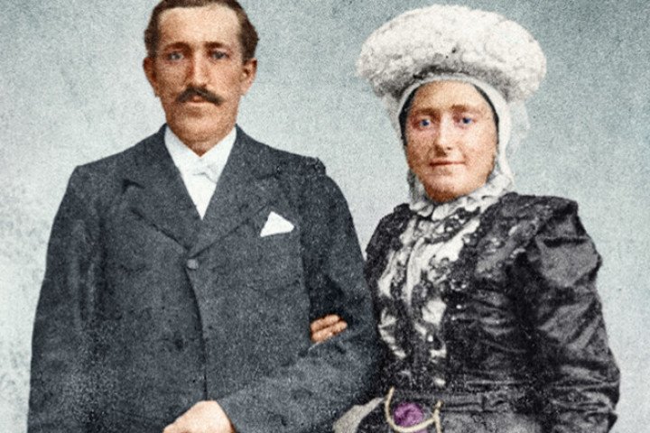 Piet (1866-1936) and Adriana (1867-1931) Crassaarts on their wedding day on Oct. 31, 1931 in Steenbergen near Bergen op Zoom. The then 35-year-old wealthy cattle trader and landowner wears a neat suit. The 34-year-old bride is dressed in a wedding gown of black silk, decorated with machine-made lace and beads. On her head the traditional Brabant hat topped with a crown. It was very common in those days to continue wearing wedding garments to church on Sundays after the wedding day. And the extraordinary thing is that this very wedding dress has been preserved in the museum collection. The dress is no longer exactly the same as it was on the wedding day: wear marks and various trims are proof that the dress has had a long life.
