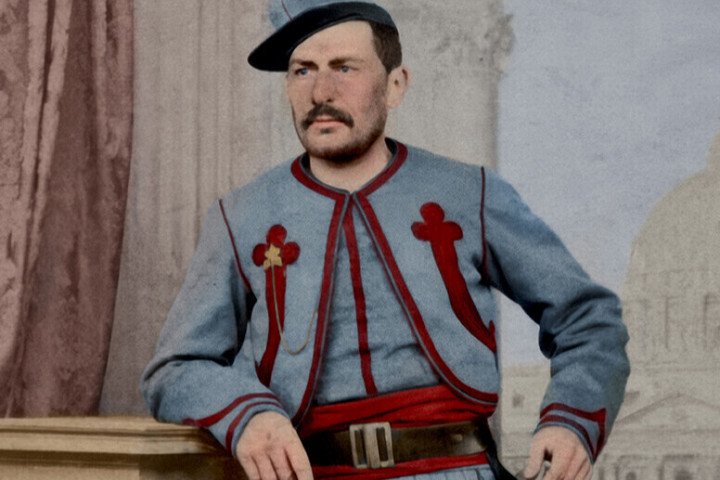 Cornelis Mermans (1835-1922) is seen here in the uniform of papal Zouave: soldier of the ecclesiastical state. In the 19th century, an international Zouave army was formed under French army command. Goal: to defend the papal state in Italy against the royals who wanted to make Italy a kingdom. The Netherlands supplied the largest number of Zouaves. Oudenbosch was the rallying point. Cornelis wears the typical zoeaven uniform: Turkish-looking clothing modelled after the French army unit in Algiers.