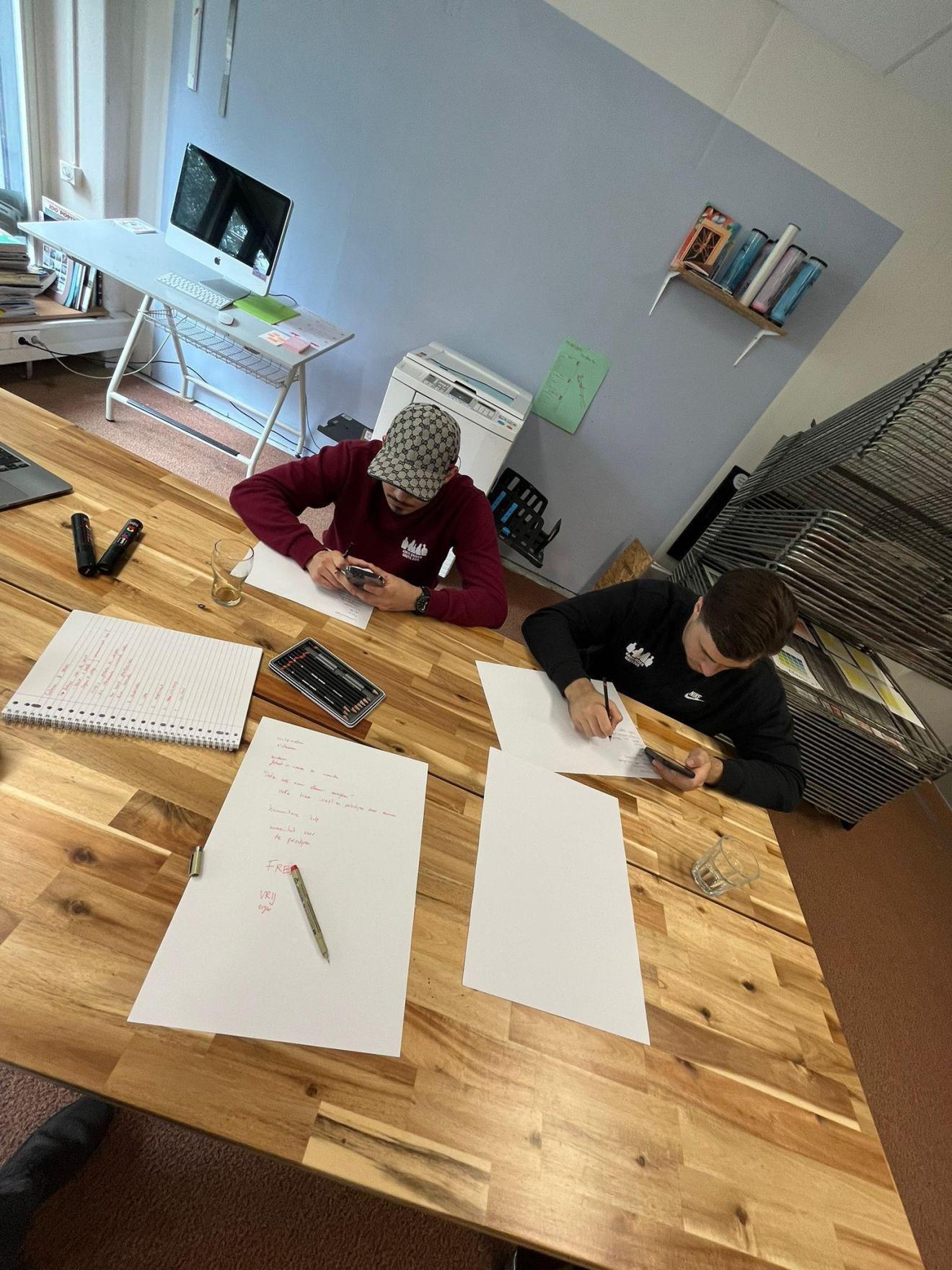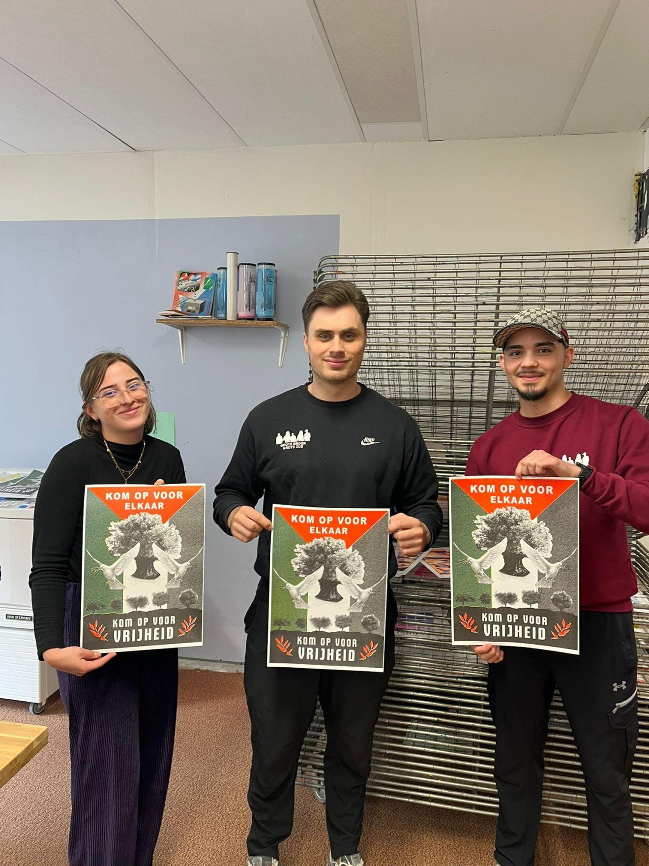 "Stand up for each other" is the slogan on the poster created in Hoge Vucht. In Daan van Bommel's studio, the young people got to work with the riso technique (printing technique). You see an olive tree and doves spreading seeds from which new trees will grow. This symbolizes the seeds you plant when you talk about freedom, and how more and more people will then start discussing the topic of ‘freedom’. With this poster, the young people want to spread this message in the neighborhood.