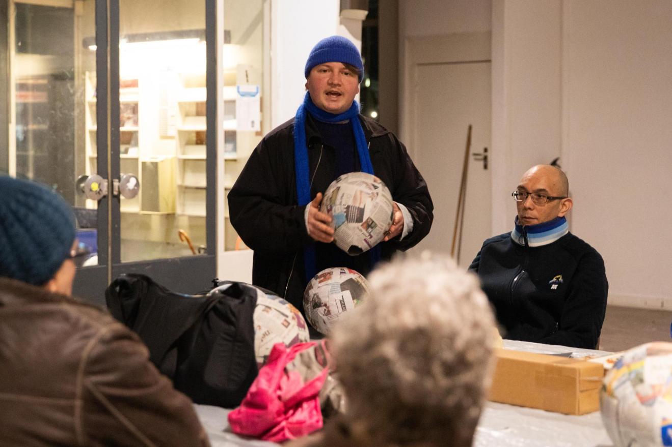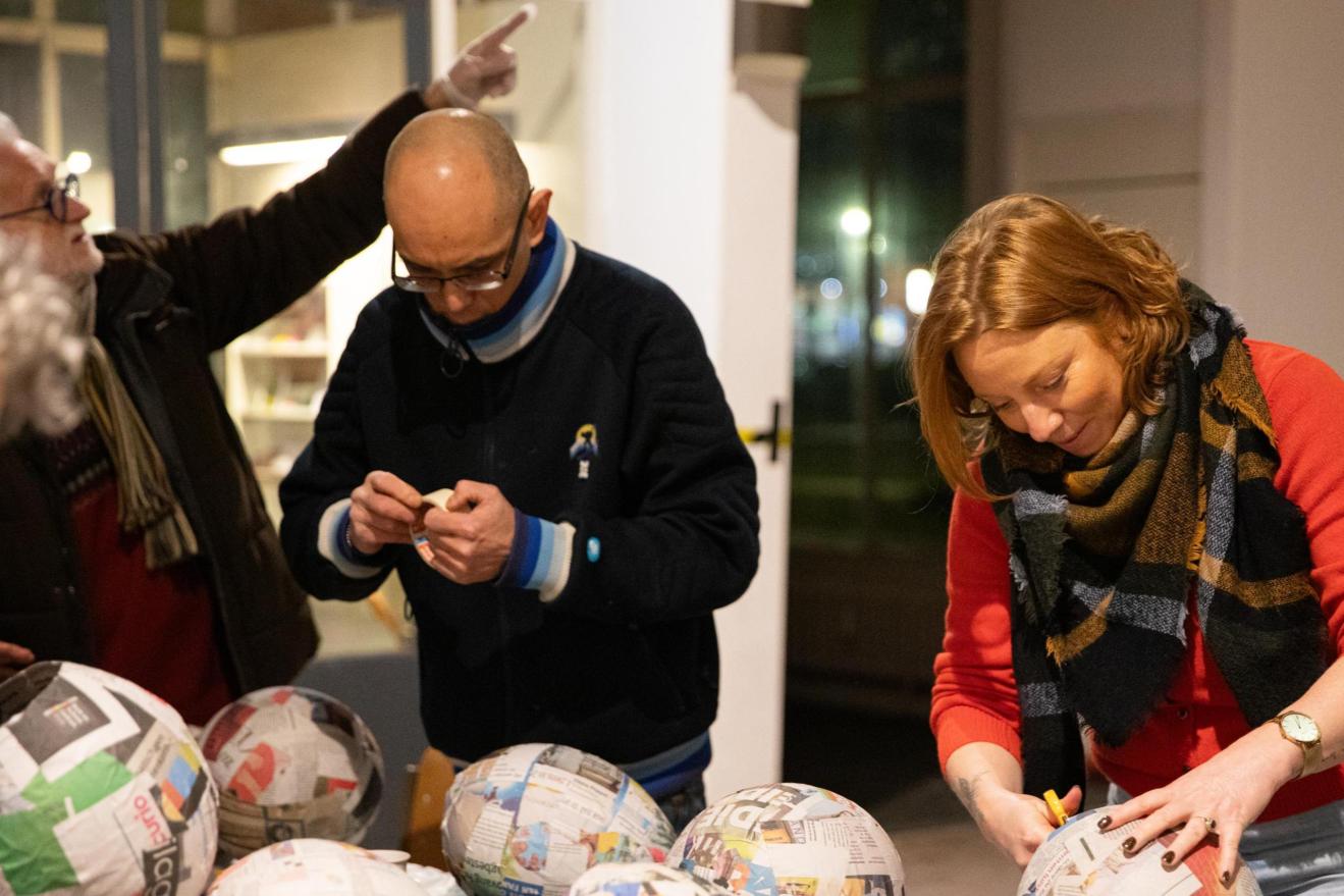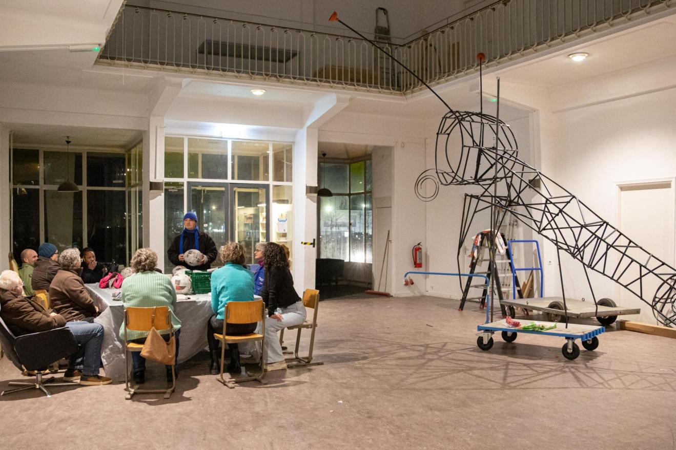 De Parade is verhuisd! Momenteel werken we iedere donderdag in Electron verder aan onze act voor de Grote Optocht. Samen verbeelden we de metamorfose van een vlinder: ei > rups > cocon > vlinder. De installatie op de foto is ons pronkstuk: de vlinder. Tijdens de Optocht hangt deze vol met beschilderde wimpels. We hebben er meer dan 300! Daarnaast maken we ook kunstwerken van papier-maché voor de tentoonstelling in projectruimte Next in het museum. Ook hier verbeelden we de metamorfose van ei tot vlinder.