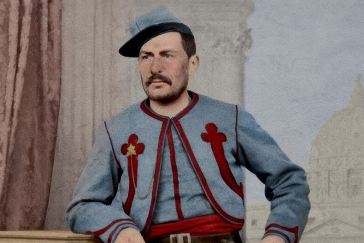 Cornelis Mermans (1835-1922) zie je hier in het uniform van pauselijk zoeaaf: militair van de kerkelijke staat. In de 19de eeuw werd onder Franse legerleiding een internationaal zoeavenleger gevormd. Doel: de pauselijke staat in Italië verdedigen tegen de koningsgezinden die Italië een koninkrijk wilden maken. Nederland leverde het grootste aandeel zoeaven. Oudenbosch was het verzamelpunt. Cornelis draagt het typische zoeavenuniform: Turks aandoende kledij naar het voorbeeld van het Franse legeronderdeel in Algiers.