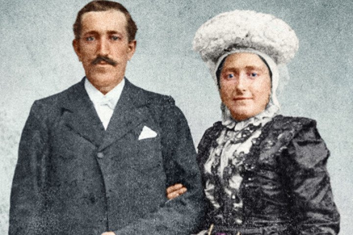 Piet (1866-1936) en Adriana (1867-1931) Crassaarts op hun trouwdag op 31 oktober 1931 in Steenbergen bij Bergen op Zoom. De dan 35-jarige rijke veehandelaar en landeigenaar draagt een keurig pak. De 34-jarige bruid is gekleed in een trouwjapon van zwarte zijde, versierd met machinale kant en kraaltjes. Op haar hoofd de traditionele Brabantse muts met daarop een kroon. Het was in die tijd heel gebruikelijk om trouwkleding na de trouwdag ’s zondags naar de kerk te blijven dragen. En het bijzondere is dat uitgerekend deze trouwjapon bewaard gebleven is in de museumverzameling. De jurk is niet meer precies hetzelfde als op de trouwdag: slijtageplekken en verschillende vermaakspoten zijn het bewijs dat de jurk een lang leven heeft gehad.