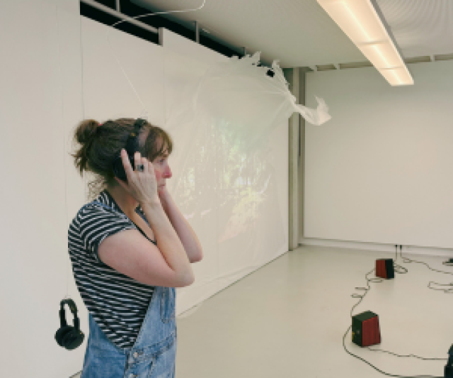 In Next loop je binnen in de ‘studio’ van Dyane Donck (Rotterdam, 1968). Donck werkt sinds 2010 aan projecten waarin ze beeldende kunst, muziek en theater laat samenkomen. Denk aan koptelefoonopera’s, geluidssculpturen en muziektheatervoorstellingen met filmprojecties.